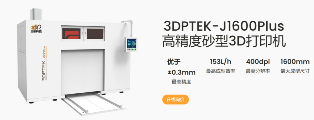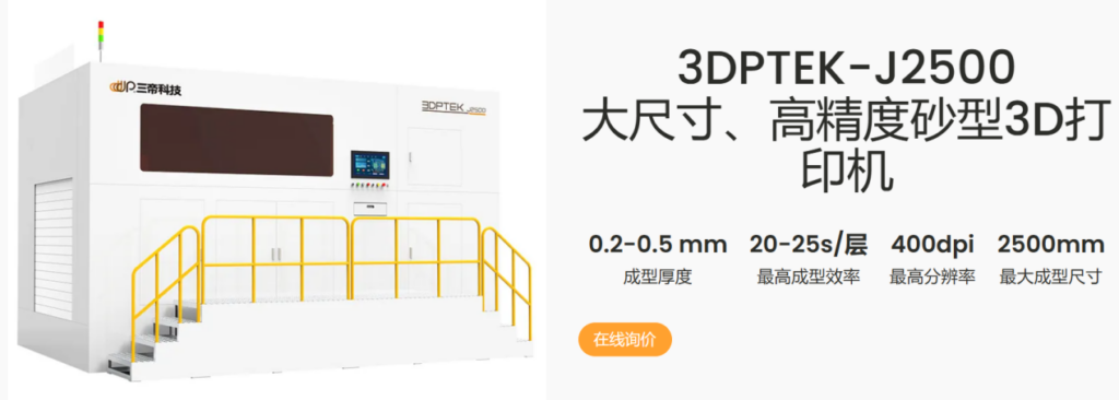 無砂箱 3D 打印機不斷實現(xiàn)技術(shù)革新,如三帝科技的 3DPTEK-J4000 采用無砂箱柔性區(qū)域成型技術(shù),可按需定制擴展打印平臺,最大能成型 4 米的砂型,滿足 10 米 + 級的生產(chǎn)需求,突破了傳統(tǒng)鑄造設(shè)備的尺寸限制,為大型復(fù)雜鑄件的制造提供了可能.