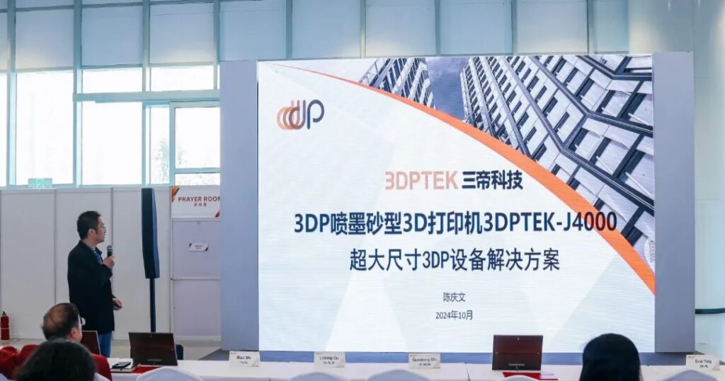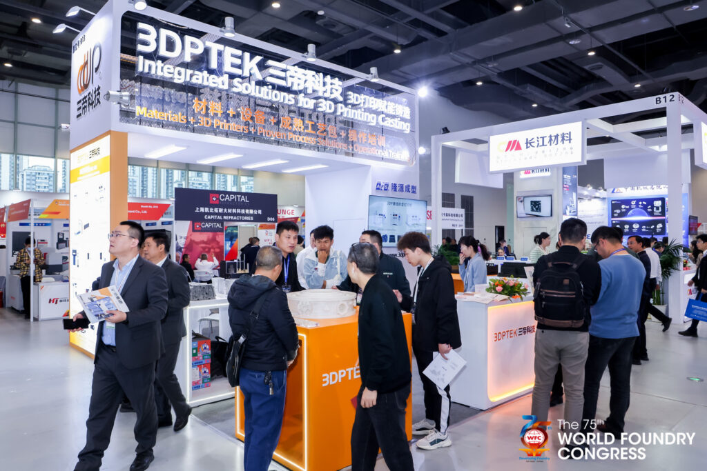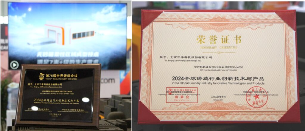 2024年10月26日,由世界鑄造組織(WFO)主辦、中國(guó)機(jī)械工程學(xué)會(huì)鑄造分會(huì)承辦的第75屆世界鑄造會(huì)議暨2024國(guó)際鑄造展覽會(huì)在“中國(guó)重裝之都”四川德陽(yáng)文德國(guó)際會(huì)展中心隆重開幕,百余家中外知名企業(yè)同臺(tái)展示全球鑄造領(lǐng)域創(chuàng)新技術(shù)及產(chǎn)品,千余名專家學(xué)者同聚共話全球鑄造行業(yè)發(fā)展。國(guó)內(nèi)領(lǐng)先的3D打印裝備與快速制造服務(wù)提供商北京三帝科技股份有限公司3D鑄造解決方案參展(展位號(hào):B13),公司自主研發(fā)的超大尺寸3DP砂型打印機(jī)3DPTEK-J4000榮膺“2024全球鑄造行業(yè)創(chuàng)新技術(shù)與產(chǎn)品”。