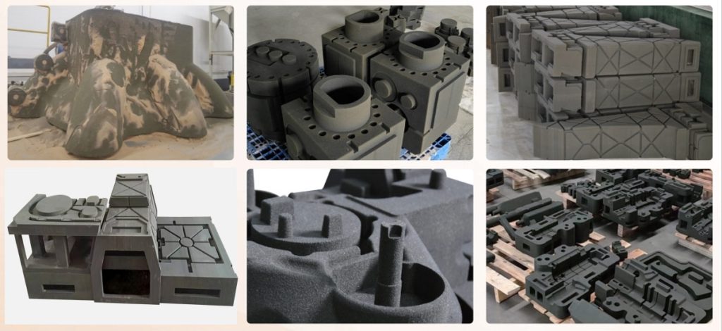 在航空航天領(lǐng)域,3D砂鑄技術(shù)可用于制造發(fā)動(dòng)機(jī)零部件、航天器結(jié)構(gòu)件、動(dòng)力裝置等重要部件??捎行Ы鉀Q超大尺寸、多維曲面、復(fù)雜結(jié)構(gòu)工件的成型難題,在小批量大尺寸模具制造以及特種行業(yè)的模具迭代升級(jí)研發(fā)上有著傳統(tǒng)制造工藝無(wú)法比擬的優(yōu)勢(shì)。在能源動(dòng)力領(lǐng)域,3D鑄造技術(shù)可被應(yīng)用于大尺寸耐壓復(fù)雜型腔結(jié)構(gòu)件、大型薄壁輕量化零部件等的制造。