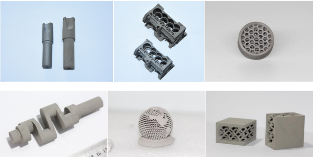 在設(shè)備基礎(chǔ)上,隆源成型公司成功開發(fā)了一系列BJ專用粘結(jié)劑配方,適用于鐵基合金、輕金屬合金、有機(jī)玻璃、陶瓷等20余種基體材料。團(tuán)隊(duì)對粘結(jié)劑理化特性、粘結(jié)劑與粉末的相互作用進(jìn)行了系統(tǒng)性研究與分析,其中水基粘結(jié)劑具綠色環(huán)保、燒結(jié)低碳氧殘留等特性,應(yīng)用效果好。脫脂燒結(jié)工藝是完成BJ金屬制造的必備后段工藝,隆源成型相關(guān)BJ金屬材料的脫脂燒結(jié)態(tài)性能均已達(dá)到MIM行業(yè)國際材料標(biāo)準(zhǔn),已具備產(chǎn)業(yè)化應(yīng)用條件。