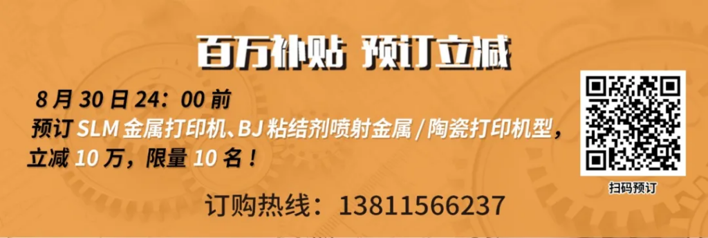 展會期間,三帝科技還將隆重推出“百萬補(bǔ)貼 預(yù)訂立減”活動,8月30日24:00前預(yù)訂BJ粘結(jié)劑噴射金屬/陶瓷打印機(jī)、SLM 金屬打印機(jī)的任一款機(jī)型,將立減 10 萬,限量 10 名,歡迎咨詢訂購!