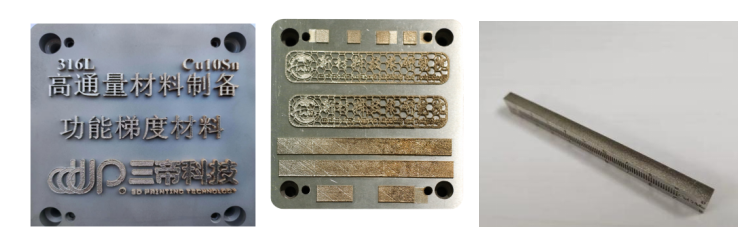 目前,公司已自主研發(fā)推出了SLM選區(qū)激光熔化金屬打印設(shè)備AFS-M120/M260、梯度金屬設(shè)備AFS-M120X(T)、多材料增減材設(shè)備AFS-M300XAS等,完成了不銹鋼/鈦合金/鋁合金/模具鋼/鈷鉻合金/鎳基合金等材料的成型及工藝開發(fā)。其中,梯度金屬打印設(shè)備AFS-M120X(T)可適用于復(fù)合金屬材料的性能研究與開發(fā),可實(shí)現(xiàn)兩種及以上多種金屬材料的連續(xù)梯度精確供粉;具備水平/垂直梯度變化方向,降低了工藝復(fù)雜性,節(jié)省粉末原材料、提升研發(fā)效率。在高通量材料制備、航空航天、汽車、醫(yī)療、模具加工等領(lǐng)域的新材料開發(fā)中具有廣闊的應(yīng)用前景。目前,三帝科技已與北京科技大學(xué)、山東理工大學(xué)、蘭州理工大學(xué)、華中科技大學(xué)、北京航空航天大學(xué)、北京鋼鐵研究總院、沈陽自動化所等眾多科研院所合作,不斷地提供先進(jìn)、可靠、實(shí)用的梯度功能金屬材料解決方案。